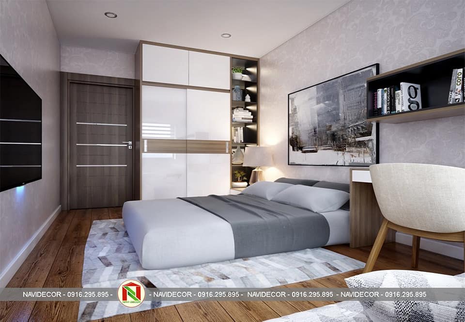 Căn phòng ngủ được KTS lựa chọn dán tường màu xám nền nã giúp giường ngủ hay tranh trang trí trên tường trở nên cuốn hút ánh nhìn.
