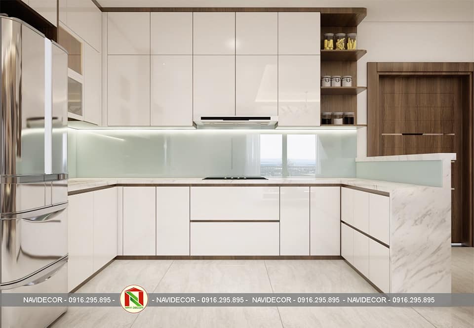 Không gian bếp lớn với với tone màu trắng chủ đạo